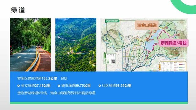 罗湖区建成绿道155.2公里,包括省立绿道、城市绿道、社区绿道等,塑造了罗湖绿道5号线、淘金山绿道等深圳市精品绿道。罗湖绿道5号线是融山水、休闲、生态和文化于一体的特色精品绿道,全线共分为山水休闲线、果林野趣线、河滨沁爽线三段,依山傍水而建,有效融合沿线自然景观和人文景观,把城市生活引入山水美景,使自然风光更加贴近市民生活,形成“一路山水、一路文化”、独具罗湖特色的风景线。被市民誉为“深圳最美绿道”。