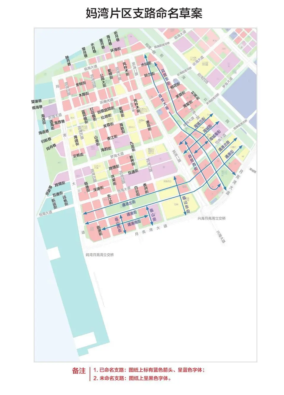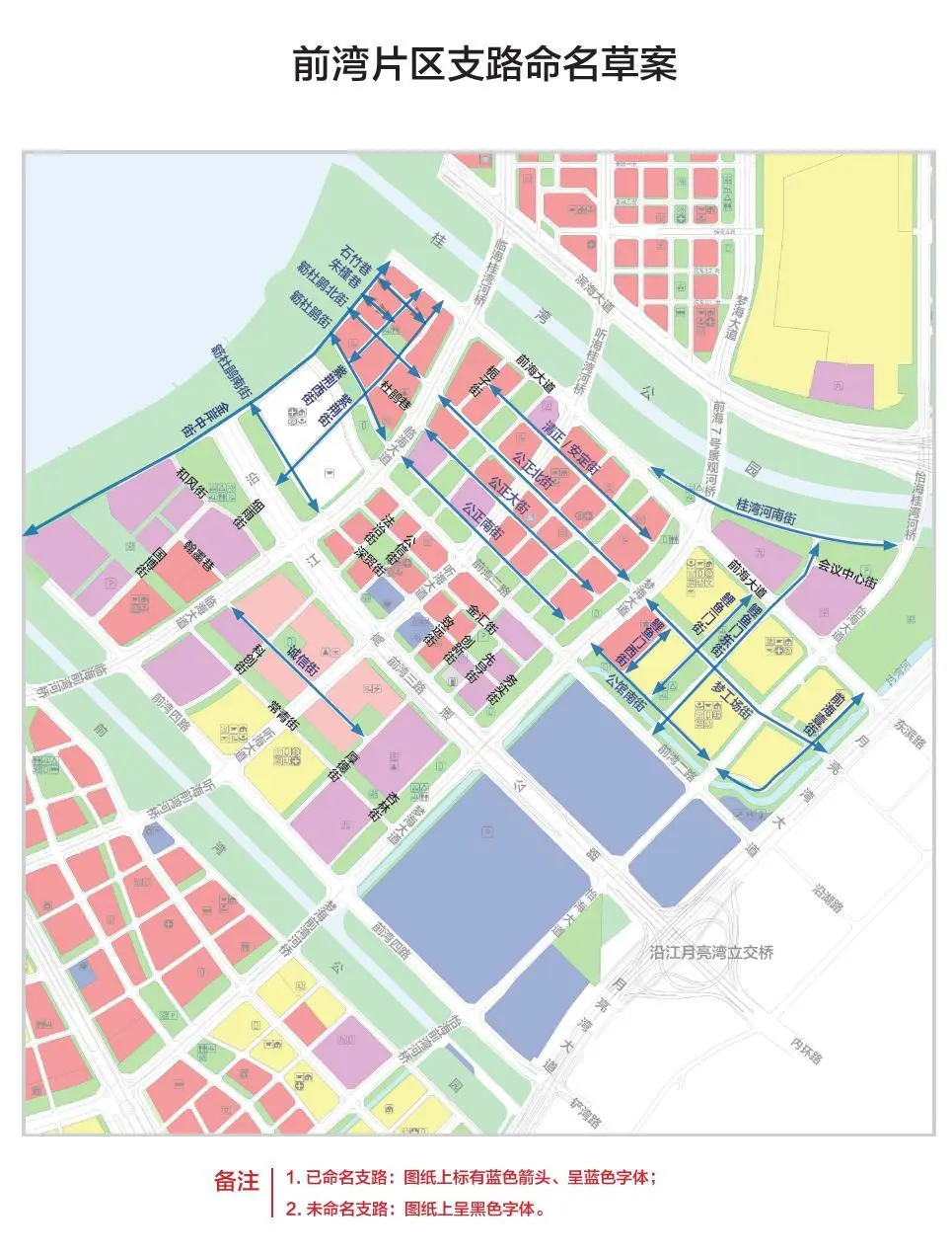 本次命名草案按照相关法规文件,结合前海桂湾、前湾、妈湾各片区的规划定位、功能布局以及建设情况,针对三大片区和重要功能区功能、项目布局等特征,对前海15平方公里支路进行了全覆盖命名。