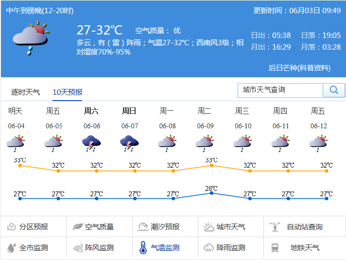 市气象台预测,3-4日多云,有雷阵雨,局部雨势较大,3日气温27-32℃,天气闷热;5-7日降雨加大,有雷阵雨,局部暴雨,伴有雷暴和8级左右短时大风。