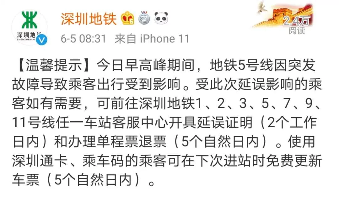 随后,深圳地铁官方微博发布温馨提示,今日(6月5日)早高峰期间,地铁5号线因突发故障导致乘客出行受到影响。受此次延误影响的乘客如有需要,可前往深圳地铁1、2、3、5、7、9、11号线任一车站客服中心开具延误证明(2个工作日内)和办理单程票退票(5个自然日内)。使用深圳通卡、乘车码的乘客可在下次进站时免费更新车票(5个自然日内)。