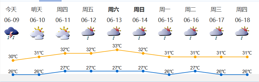我市阴天,有中雨,局部大雨到暴雨,伴有雷暴;气温26-30℃;西南风3-4级;相对湿度75%-100%。
