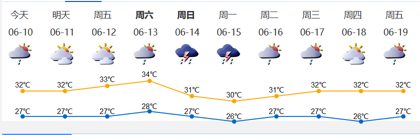 深圳多云,有(雷)阵雨,局部有大雨;气温27-32℃;西南风3级;相对湿度70%-95%。