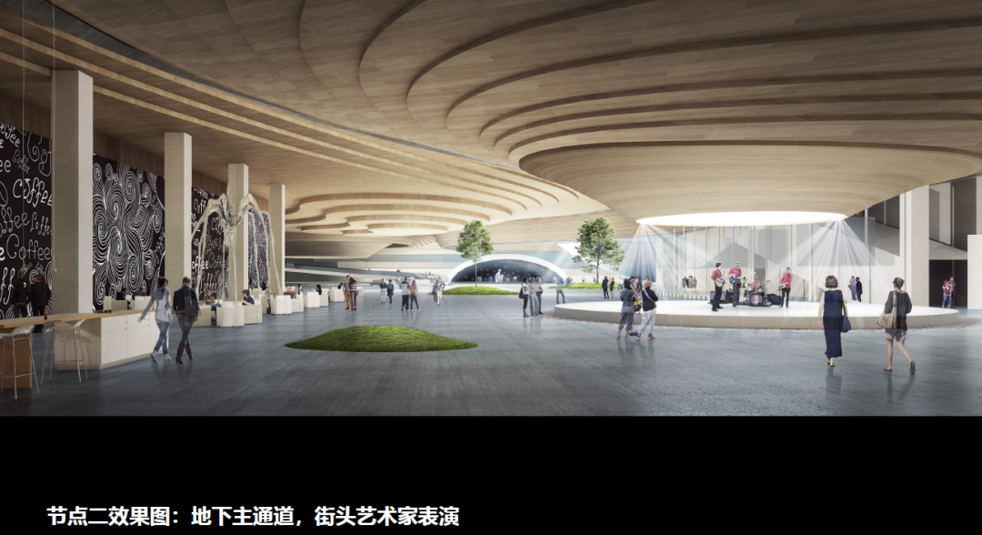 穿过洞穴般的地铁出口,景象瞬间开阔,阳光透过构筑物和煦的洒下,伴着两侧绿植和艺术墙缓缓升到负一层,达到商业线性轴和艺术通道的交汇处。