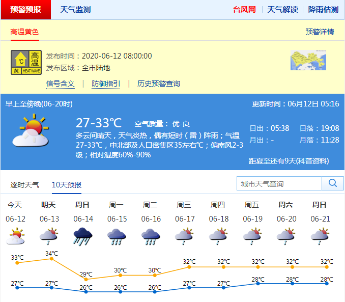 见圳客户端·深圳新闻网2020年06月12日讯 深圳市气象台于2020年06月12日08时00分在全市陆地发布高温黄色预警,预计12-13日深圳市最高气温将升至35℃以上,信号可能持续2天,做好防暑降温工作,避免长时间户外或者高温条件下的作业。