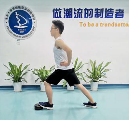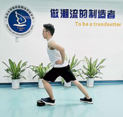 站姿拉伸,弓步站位,拉伸脚的脚掌踩在合适高度的垫片上,后半脚掌落地,双手置于腰间保持平衡;身体前倾用力,保持30秒-60秒/次×3-5组。