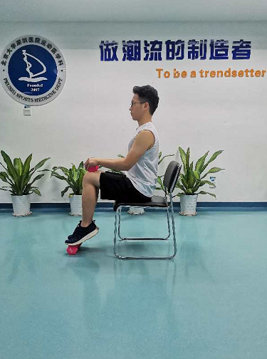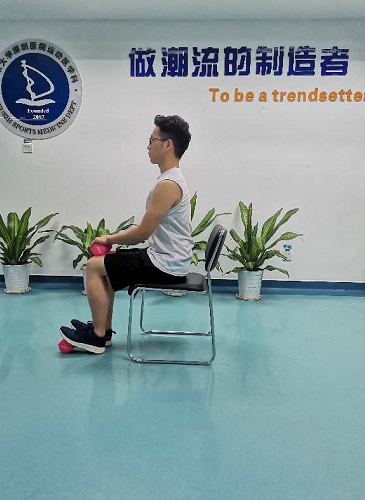 坐姿提踵,坐在椅子上,大腿平行于地面,小腿垂直于大腿,前脚掌置于有一定高度的垫片上,双手持一合适的重物于膝盖上;小腿发力慢抬至最高点保持3秒钟后慢放至最低点保持3秒钟,此动作重复30次-50/次×3-5组。