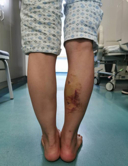 20岁出头的杨柳(化名)右小腿注射肉毒素后发生肌肉挛缩,导致右足跟不能着地,双下肢不等长,跛行。