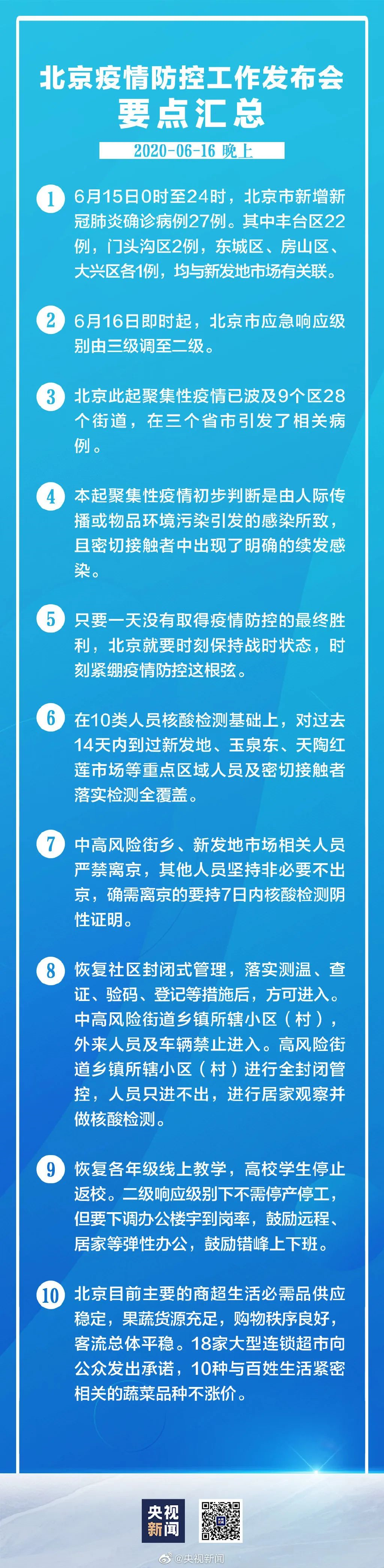 ⑥6月16日即时起,北京应急响应级别调整为二级。北京中高风险地区相关人员严禁离京,非必要不出京。北京中小学明起一律停止到校上课,北京市高校学生停止返校。北京下调办公楼宇到岗率鼓励弹性办公。