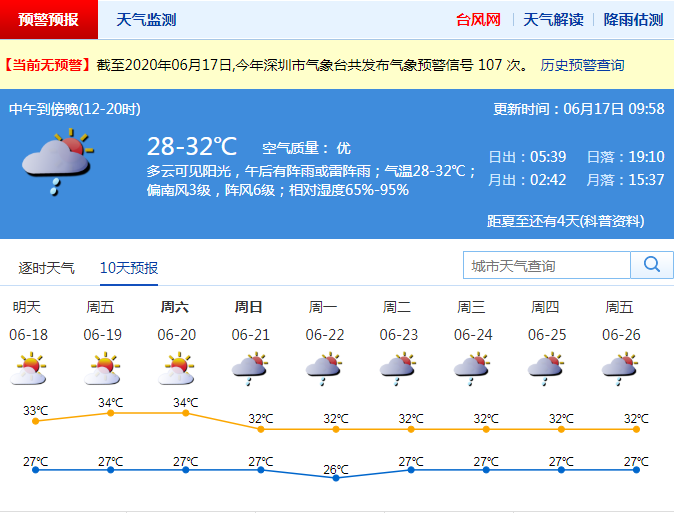 见圳客户端·深圳新闻网2020年6月17日讯 据深圳市气象局消息,6月17日,深圳多云可见阳光,午后有阵雨或雷阵雨;气温28-32℃;偏南风3级,阵风6级;相对湿度65%-95%。