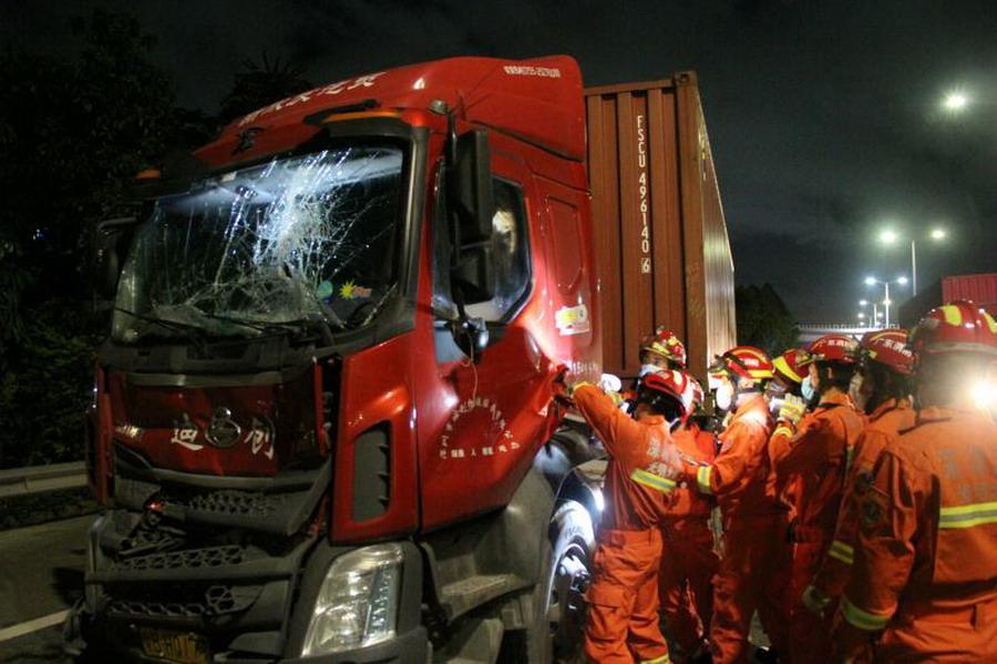 见圳客户端·深圳新闻网2020年6月17日讯(见圳客户端、深圳新闻网记者 张喆 通信员 戴沛旭)6月16日4时16分,位于龙大高速往东莞方向黄江公明出口500米处,两辆大货车在行驶过程中发生追尾,后车司机被困驾驶室。接警后,光明消防救援站迅速出动4车22名指战员赶赴现场处置。到达现场后救援人员第一时间对现场拉起警戒,随后利用破拆工具破开车门救出被困驾驶员,经检查询问男子身体无大碍。