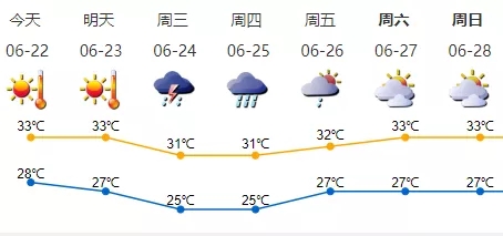 我市晴天间多云,天气炎热,局地有短时雷雨;气温28-33℃,中北部地区最高气温35℃;南风3级,阵风5-6级;相对湿度60%-90%。