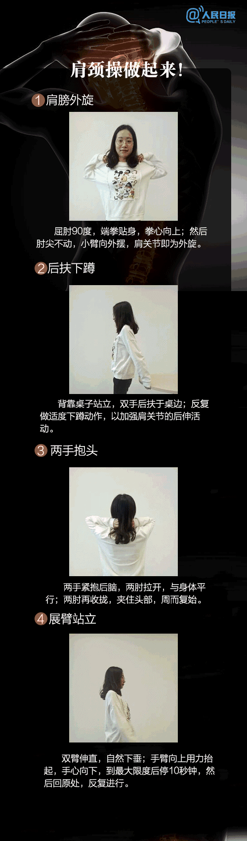 3、每天定时前后、左右活动颈部,有意地保持颈部适当上仰。