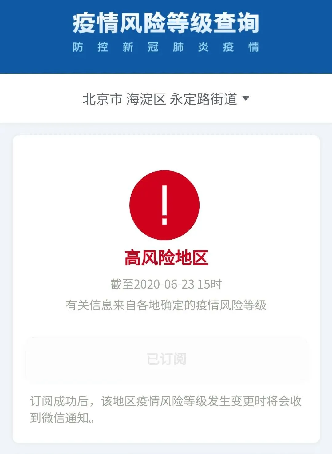 截至6月23日15时,北京市海淀区永定路街道由中风险调整为高风险。