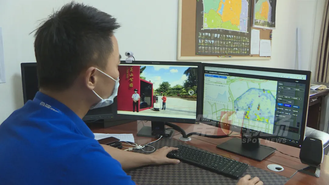 在莲花山公园的南门口,安保人员戴着一顶智能头盔,入园游客的体温,可以实时显示在眼前的屏幕上,一旦温度达到37.3℃,就会发出警报。如果游客没有戴口罩,门口的智能机器人也会提醒:“请您戴上口罩”。