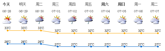 我市多云间晴天,局地有短时(雷)阵雨,天气闷热;气温28-33℃,中北部最高气温达35℃;西南风3级;相对湿度55%-95%。
