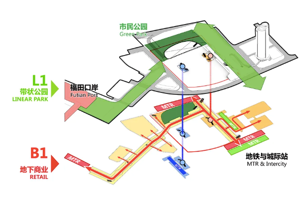 地下一层——轨道换乘:通过“城市通廊”实现周边多条轨道站点的高效换乘,并实现新旧口岸、轨道交通及城市绿轴的高度复合。