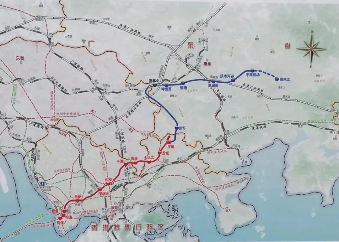深惠城际:起自前海合作区,经西丽、龙华、平湖、大运、惠州新圩、沥林、惠城南站至惠州机场,全长130公里,计划总投资773.1亿元。线路在惠州沥林北站与莞惠城际接轨,利用既有莞惠城际至惠州中心区。预留延伸至惠东条件。