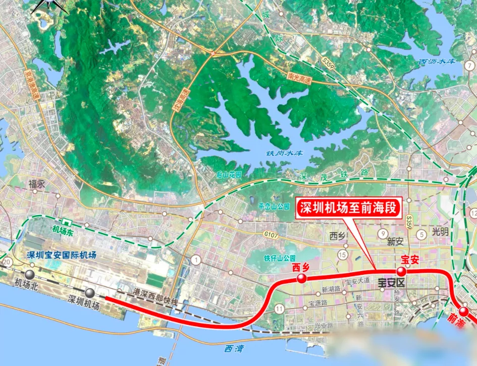线路全长15.2km,起于深圳机场站,出机场后下穿西湾海域至宝安大道,沿宝安大道地下敷设,经宝安区航城、西乡、新安街道至前海综合交通枢纽。