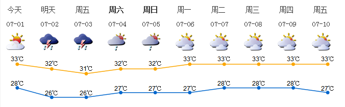 我市晴天间多云,局地有短时(雷)阵雨;气温28-33℃,中北部及人口密集区最高气温可达35℃以上;偏南风2-3级;相对湿度60%-90%。