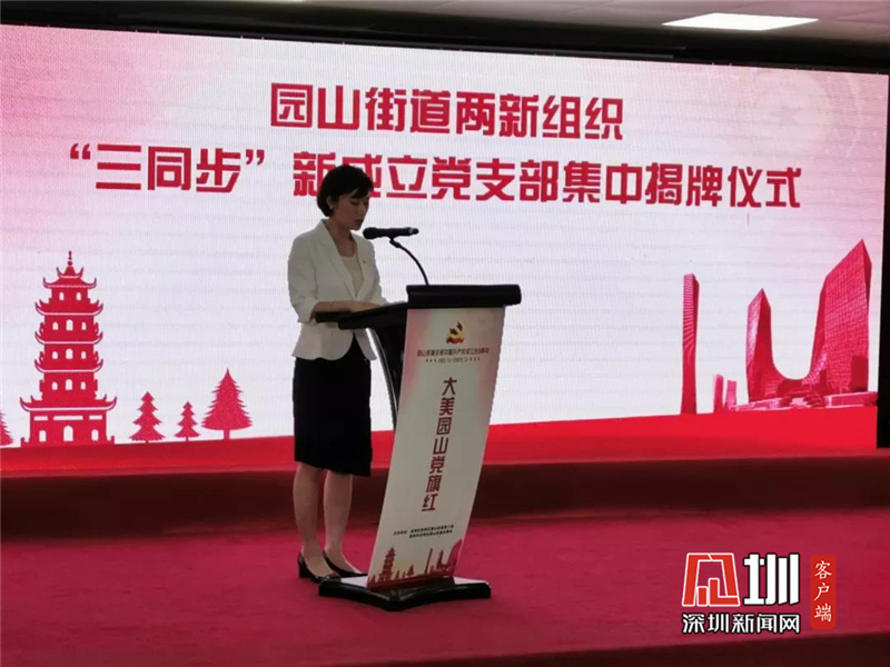见圳客户端·深圳新闻网7月2日讯(见圳客户端、深圳新闻网记者 武媛媛 通讯员 陈锦章)七一党建旗帜飘,两新党建别样红。7月1日,在中国共产党成立99周年之际,园山街道举行两新组织党组织集中揭牌仪式,街道党工委书记朱云,街道党工委副书记、办事处主任丁正红等街道领导班子成员参加揭牌仪式,并为深圳市干霸干燥剂(深圳)有限公司党支部、深圳市大与文体度假中心有限公司党支部、金柏柔性电路(深圳)有限公司党支部等10个新组建的党支部揭牌。此次园山街道“红帆领航之家”新添10个成员,标志着街道持续推动两新党建工作取得新成效。