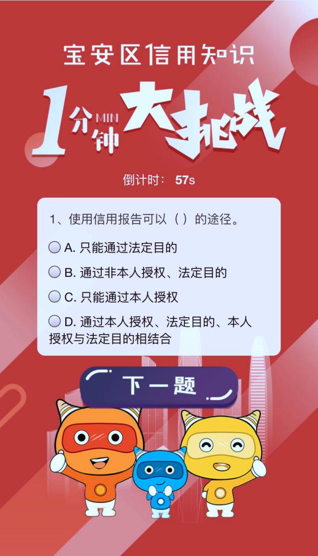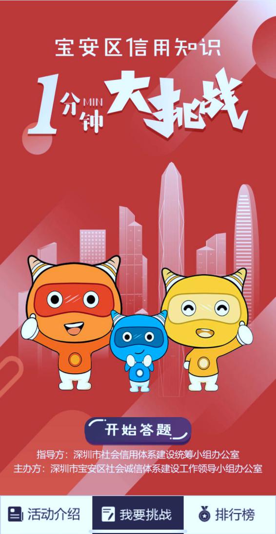 有道是“诚信走遍天下、失信寸步难行”,诚实守信是人与人交往的一张名片,更是行走社会的一张通行证。宝安区信用知识“1分钟大挑战”线上答题活动,让你随时随地就能在手机上轻松学习信用知识!活动将于7月13日正式开始,持续两周,于7月27日截止。