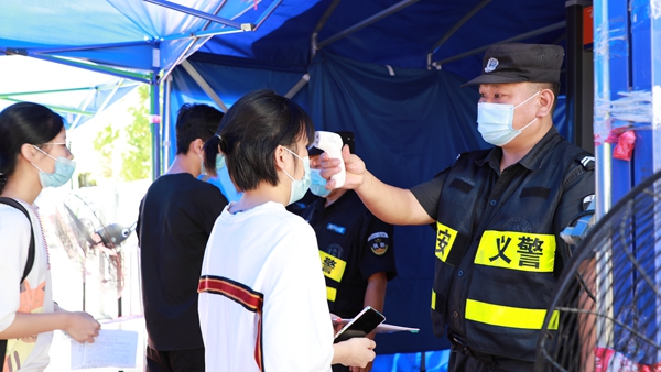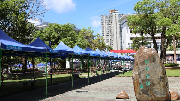 考生们在考点门口经过测温后,便顺利进入考场踩点。记者在现场看到,为应对暴雨天气,学校自校门口至教学楼,沿路搭建了遮雨棚;并在一楼大厅的休息处,为考生提供饮用水、干毛巾和干净的校服备用。LED屏幕上有对考生的诚挚祝福,校园里挂好了对考生的温馨提示,为考生营造了安静舒适的良好氛围。
