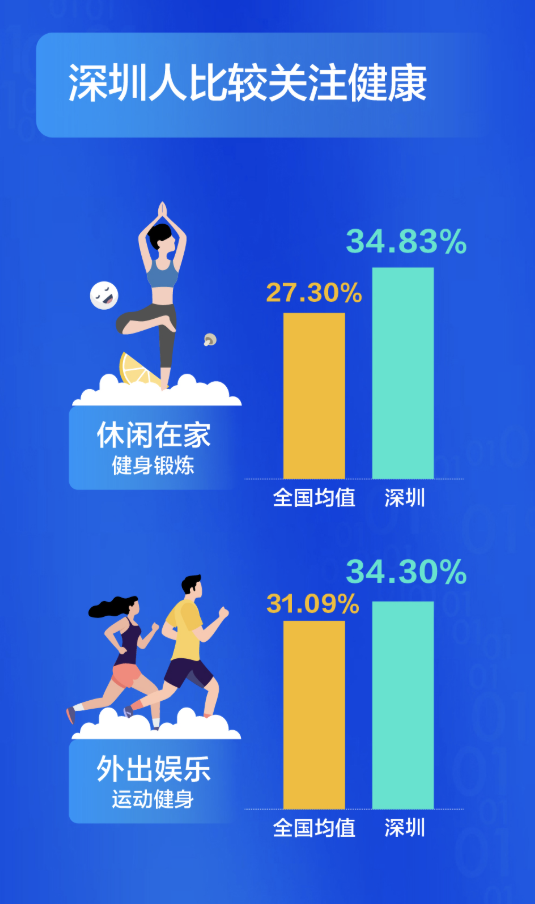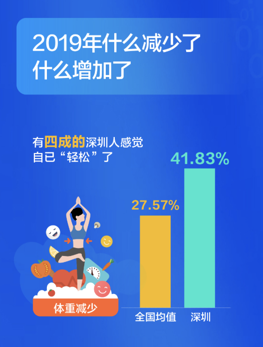 深圳人比较关注健康,不管是宅在家还是外出娱乐,他们选择运动健身的比例都超过全国平均水平,对健康的投资,成就了又一个“苗条之城”。过去这一年,有四成的深圳人感觉自已“轻松”了,体重减少的人群比例高出全国近14个百分点。甩掉了赘肉的同时,深圳人还感觉在时间、朋友、收入这三方面的收获在增加。尤其是时间,超出了全国均值8个百分点。
