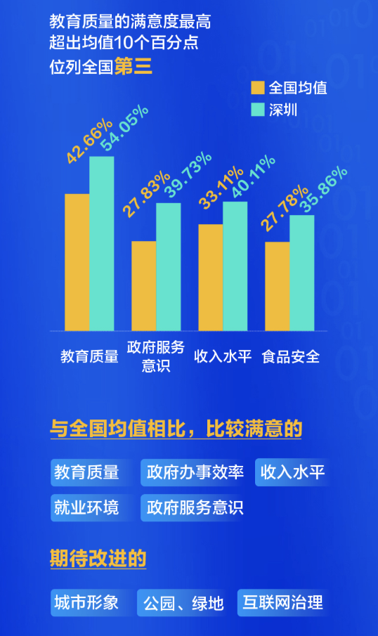 在针对城市治理能力和社会服务的20多项满意度指标中,深圳有19项高于全国省会城市和直辖市平均水平。其中,市民对教育服务的满意度最高,超出均值10个百分点,位列全国第三,其次是治安状况和水、空气质量,而在政府服务意识和食品安全的满意度,也排在全国同类第一名。此外,日常生活中的收入和就业,也让深圳人感觉比较踏实。