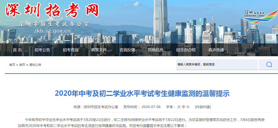 见圳客户端•深圳新闻网2020年7月6日讯(读特首席记者 姚卓文)7月6日,深圳市招考办发布温馨提示,为切实做好疫情常态化防控工作,7月6日起所有参加深圳市2020年中考和初二学业水平考试的考生须进行连续健康状况监测。未申报健康码的考生不予发放准考证,不得参加考试。