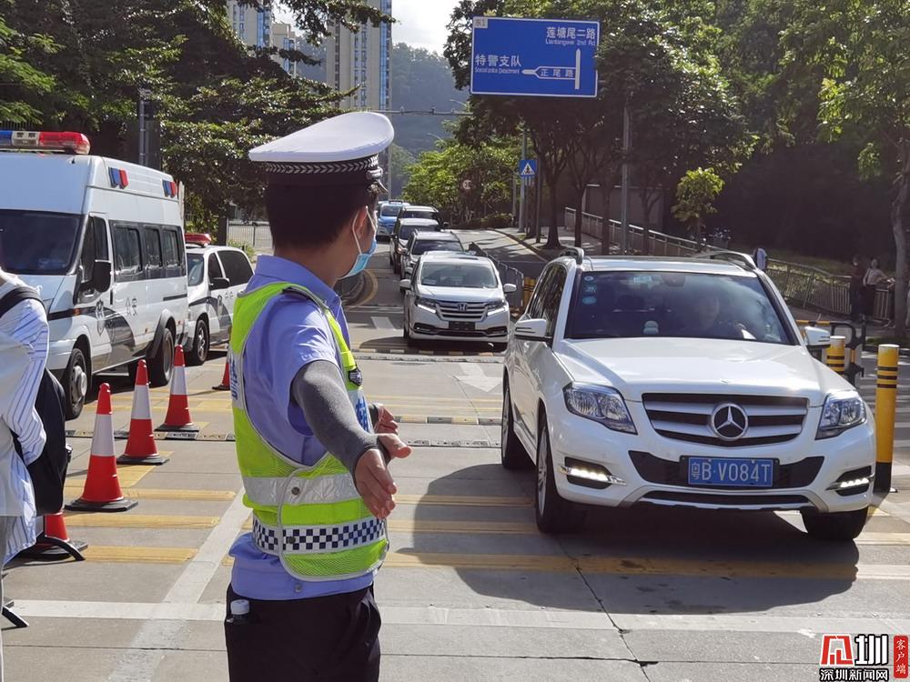 【红岭中学】考点门口正在指挥车辆通行的交警。