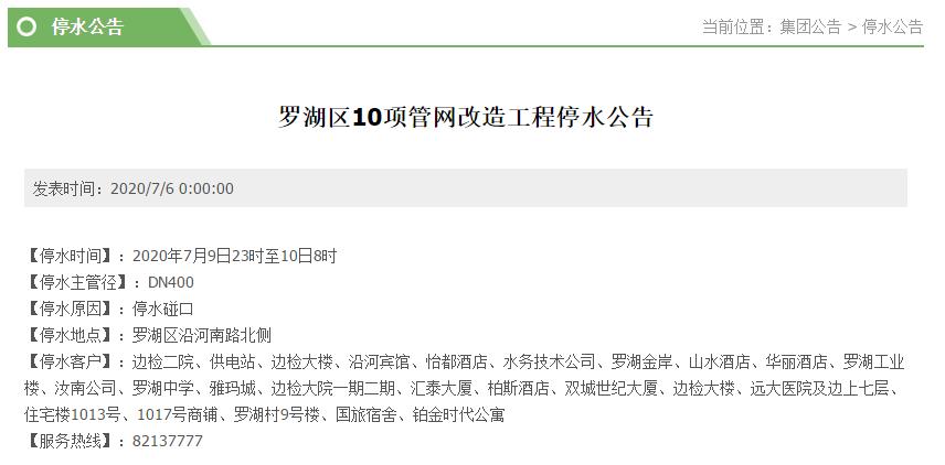 2020年7月9日23时至10日8时,罗湖区边检二院、罗湖金岸小区、边检大院一期二期、罗湖村9号楼、铂金时代公寓等小区将停水9小时。