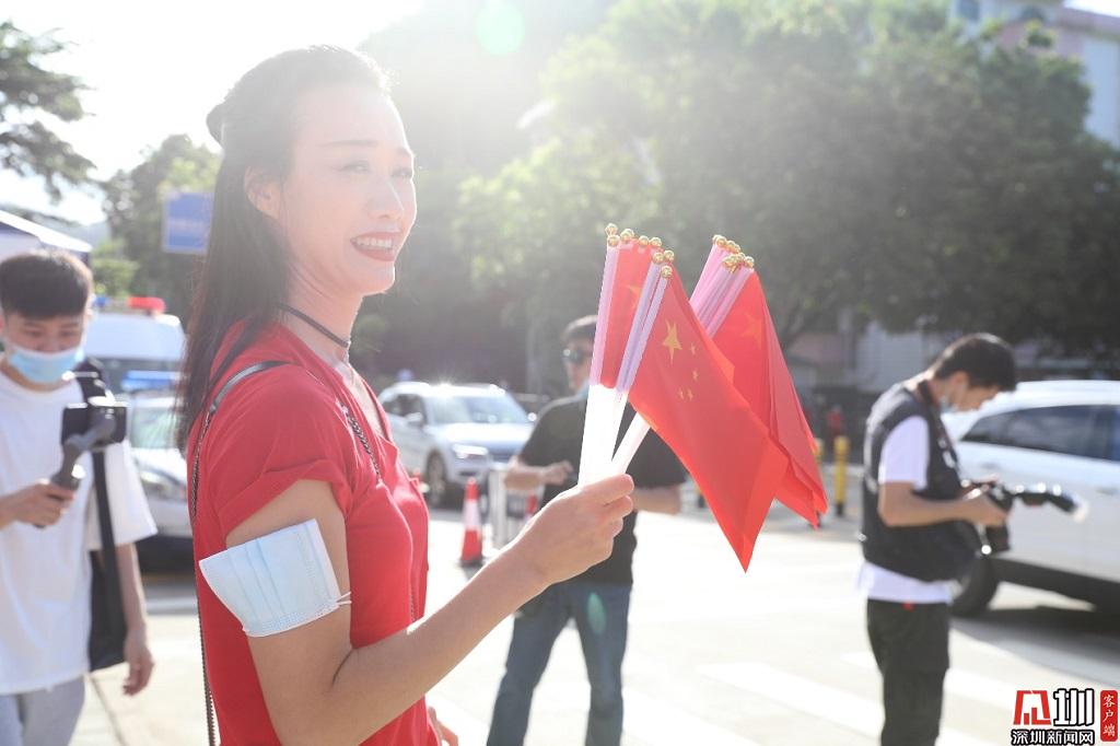 一名家长自费购买100个小国旗发放给考生,为他们加油助威。