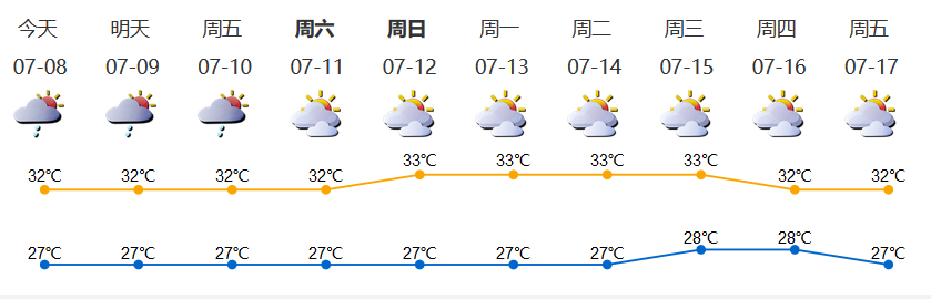 我市多云间晴天,有短时雷阵雨,天气闷热;气温27-32℃,中北地区最高气温34-35℃;西南风3-4级,阵风6-7级;相对湿度60%-95%。