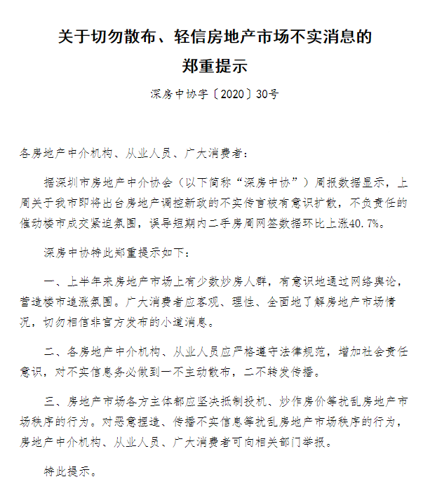 深圳市房地产中介协会提示:上半年来房地产市场上有少数炒房人群,有意识地通过网络舆论,营造楼市追涨氛围。广大消费者应客观、理性、全面地了解房地产市场情况,切勿相信非官方发布的小道消息。