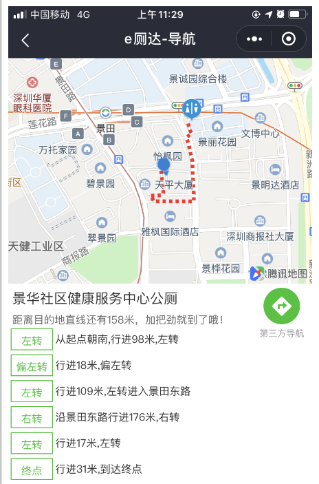 第三个功能为导航找厕所。既然已经查看到周边有厕所分布,怎能不知道具体线路呢?“e厕达”中的“带我去”按钮可以轻松引领你去往定位的公厕。