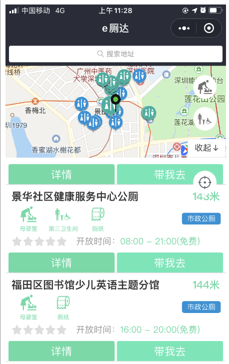 “e厕达”主要有四个隐藏功能,第一是能够自动搜索厕所。市民只要微信搜索“e厕达”小程序,首页会自动显示附近厕所的分布位置。