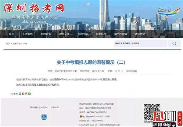 7月7日,深圳市招生考试办公室发布关于中考填报志愿的温馨提示(二),其中提到,将翠园中学2020年新生住宿情况由原提供550个床位更改为全寄宿。