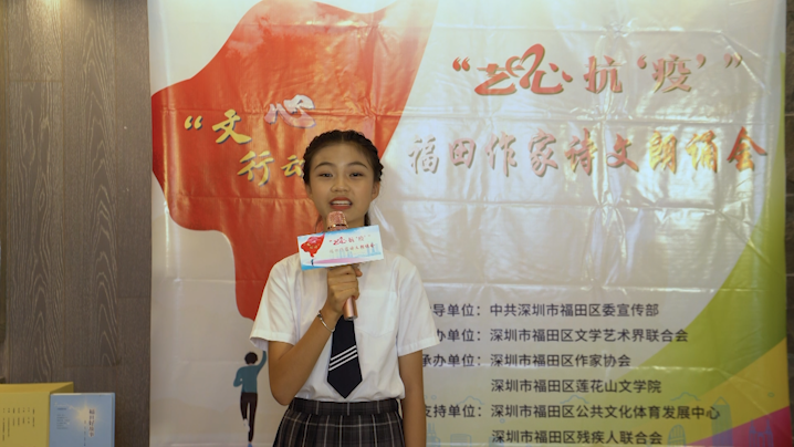 在深业上城,十多位活跃在福田的诗人、作家共同携手,“云端”发声,为战斗在各条战线上的抗疫者加油鼓劲儿。曾担任中央电视台央视《半边天》《今日说法》等栏目编导、记者的陈慧,及毕业于中央戏剧学院表演系,现为中国电影家协会会员的金道鑫鑫等名师名家闻讯,也以自己的方式参与了本次“云”朗诵。