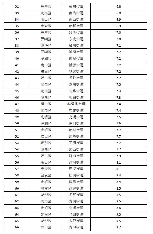 排名前十的街道是:福保街道、福海街道、海山街道、西乡街道、南园街道、清水河街道、粤海街道、石岩街道、石井街道和莲花街道;排名倒数后十的是:观澜街道、坪地街道、龙田街道、大浪街道、马田街道、公明街道、龙岗街道、龙华街道、沙井街道和凤凰街道。