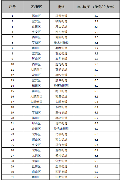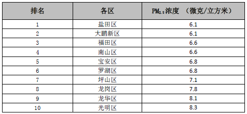各区PM2.5平均浓度在6.1-8.3微克/立方米之间,浓度较低的有盐田区、大鹏新区、福田区和南山区,浓度较高的有光明区、龙华区和龙岗区。