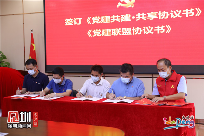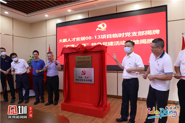 活动在庄严的国歌声中拉开序幕。首先,与会领导为“大鹏人才安居08-13项目临时党支部”、“共建、共享特色党建活动基地”进行了揭牌,项目临时党支部与新区住建局党支部签订了《党支部结对共建协议书》;新区住建局、新区群团工作部、街道办布新社区、大鹏人才安居公司和中建八局五方共同签订了《党建共建·共享协议书》和《党建联盟协议书》,同时对项目党员突击队进行了授旗。