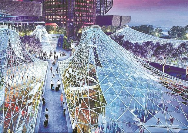 方案的中段为车站广场,“水晶山丘”屋面覆盖着地下车站枢纽大厅,同时也在地面创造出造型独特的城市地标。光影和夜景效果与交叉的蓝花楹大道配合,打造一个极具设计感的交通集散空间。地下共享大厅、地下森林与地面广场、周边建筑建立视觉联系,成为中央绿轴美景的一部分。