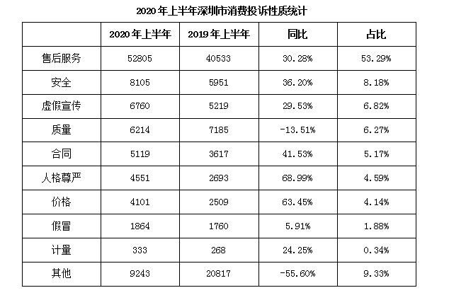 根据《情况分析》,2020年上半年,深圳市消委会收到的消费投诉问题性质最多的为售后服务,共52805宗,占比53.29%;其次为安全问题,共8105宗,占比8.18%;第三是虚假宣传问题,共6760宗,占比6.82%。有关人格尊严问题、价格问题的投诉量与2019年相比均同比上涨超过60%;有关质量问题的投诉量与2019年相比均有所下降。