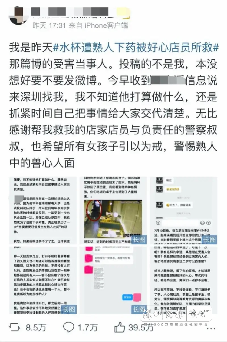 见圳客户端·深圳新闻网2020年7月13日讯(深圳商报记者 黄磊 实习生 邹小龙)7月12日,深圳一名女网友发微博称,自己和朋友在深圳一自助餐厅吃饭时,朋友趁其离开期间在她的杯中下药。所幸,该自助餐厅店员发现后及时将杯子收走,避免她饮用。读创/深圳商报记者从深圳福田警方获悉,警方已介入调查此事。