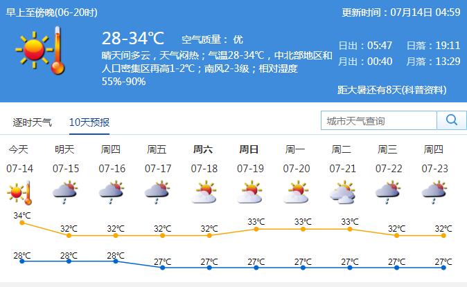 见圳客户端·深圳新闻网2020年7月14日讯 14日晴天间多云,天气闷热;气温28-34℃,中北部地区再高1-2℃;南风2-3级;湿度55%-90%。15-17日多云,有短时(雷)阵雨;18-20日天气闷热,局地偶有短时阵雨。