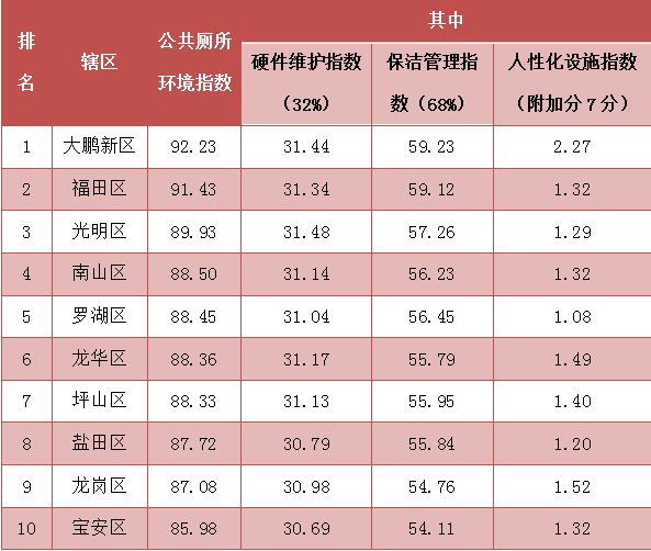 见圳客户端·深圳新闻网2020年7月14日讯(见圳客户端·深圳新闻网记者 叶梅)近日,深圳市城市管理和综合执法局发布公厕环境指数测评成绩。6月份深圳市公共厕所环境指数总得分为88.54分,环比下降0.62分,基本保持平稳。其中,硬件维护得分为31.09分(满分32分),保洁管理得分为56.27分(满分68分)。排名方面,大鹏新区、福田区、光明区分列各区排名前三,口岸、地铁、市政公厕分列各行业排名前三。
