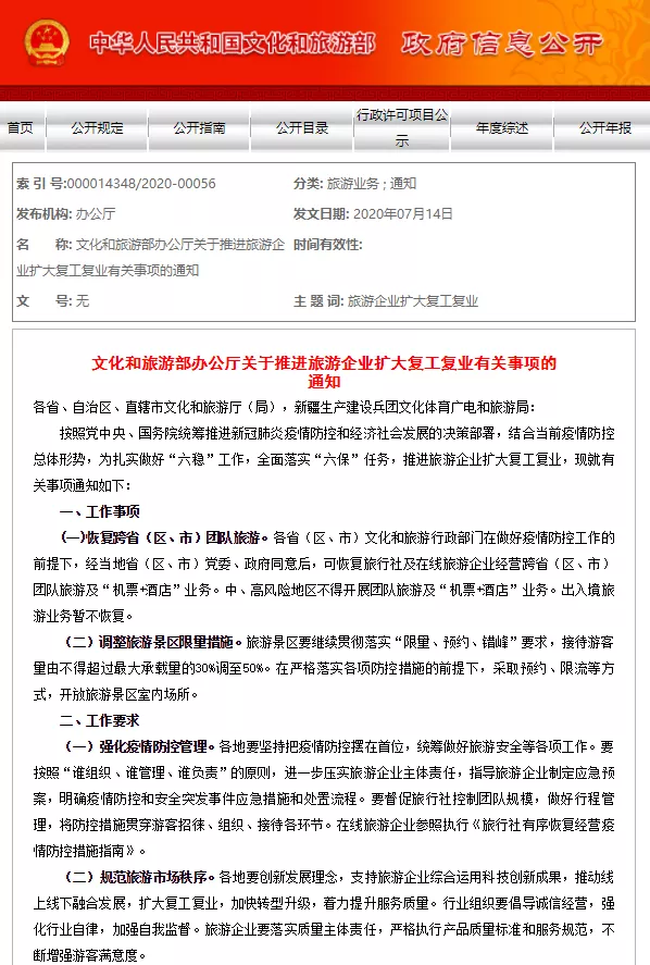 见圳客户端•深圳新闻网2020年7月14日讯(见圳客户端、深圳新闻网记者 陈婕)7月14日晚,文化和旅游部发布相关通知:恢复跨省(区、市)团队旅游。各省(区、市)文化和旅游行政部门在做好疫情防控工作的前提下,经当地省(区、市)党委同意后,可恢复旅行社及在线旅行企业经营跨省(区、市)团队旅游及“机票+酒店”业务。