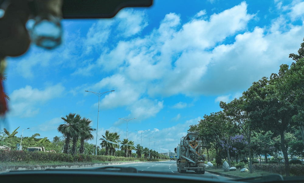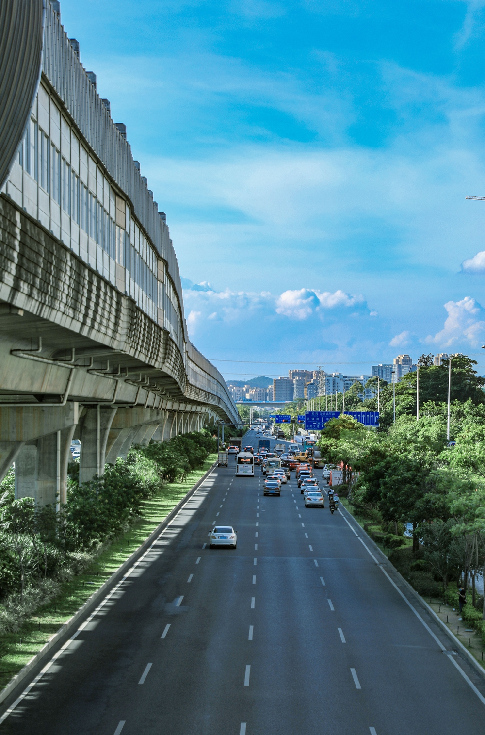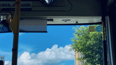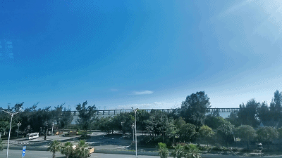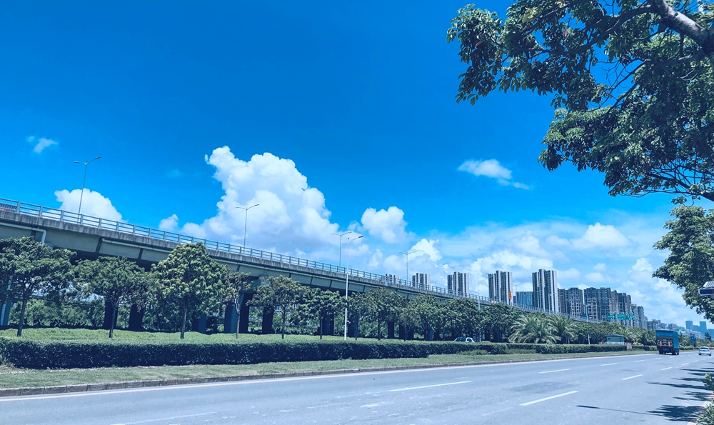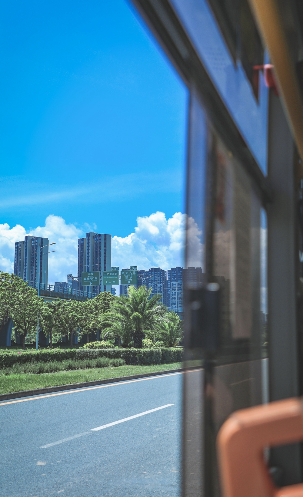 从公交车或者出租车的窗外,路过宝安的建筑、道路,还有葱郁的植物、笔直的街灯,像琴键一样划过。而蔚蓝的天际,是它们最最美丽的幕布。