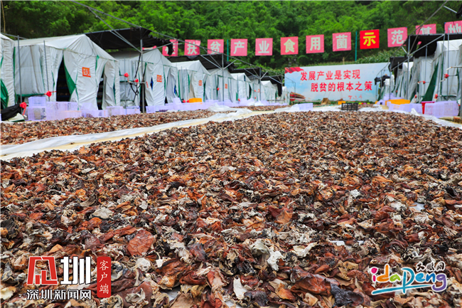 粤桂扶贫产业食用菌示范基地工作人员向记者展示其新鲜采摘的木耳