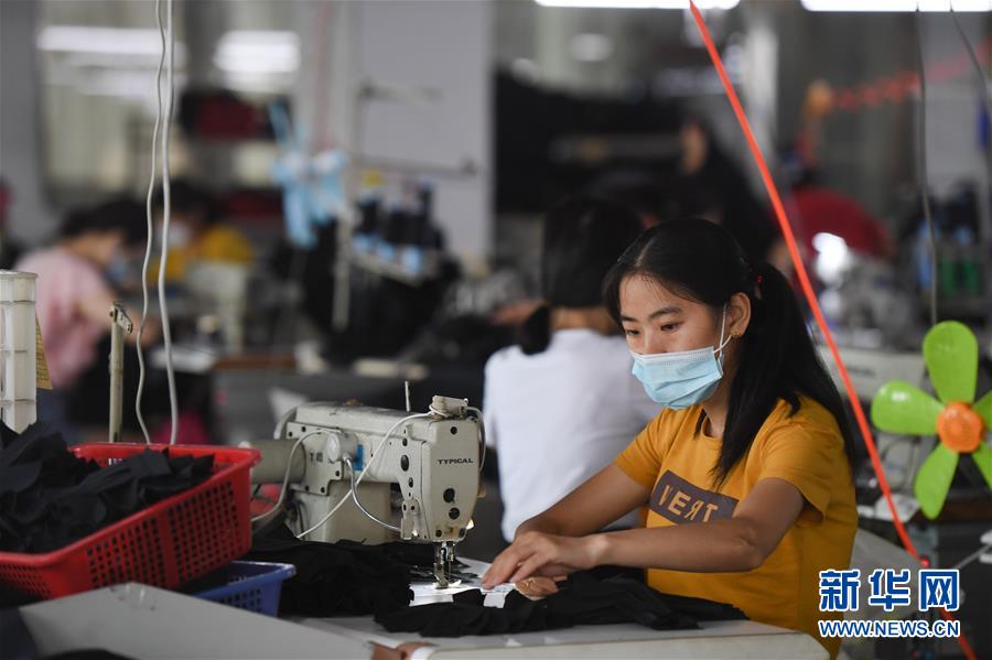 7月15日,在福建省石狮市一家体育用品有限公司,工人在生产内销的服装。新华社记者宋为伟摄